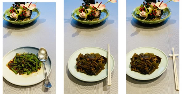 2、采用“双筷制”时,在每个餐位摆放双筷,摆放在餐盘右侧,私筷在左,公筷在右。  图2-1:双筷制摆放示范一