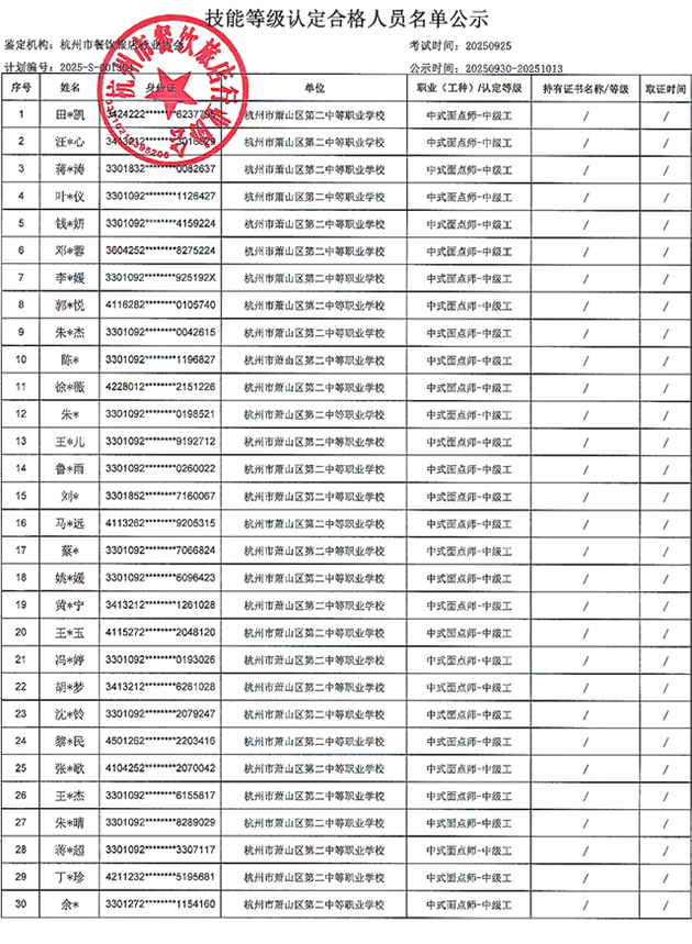 计划号:2025-S-001304 认定单位:杭州市餐饮旅店行业协会 公示期自即日起5个工作日(公示时间:20250930-20251013),如有异议,请在公示期内以书面形式进行实名反映(以邮戳日期为准)。通讯地址:杭州市上城区庆春路159号中河大厦915A;受理单位:杭州市餐饮旅店行业协会;联系电话:87243090。
